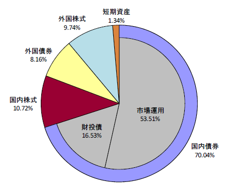また、公的年金もその一部が株で運用されています。年金保険料がそのまま現金で積み立てられているわけではなく、株などで増やしてから年金として支払われます。公的年金の運用を行う「年金積立金管理運用独立行政法人」のウェブサイトでは、積立金がどんな形で運用されているかが公表されています。下のグラフのように国内の株だけでなく、外国株にも10%近くが振り分けられています。国内株とあわせれば20%を超えています。
