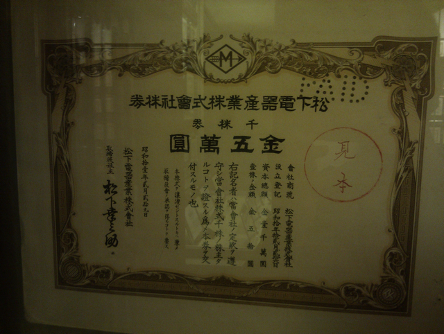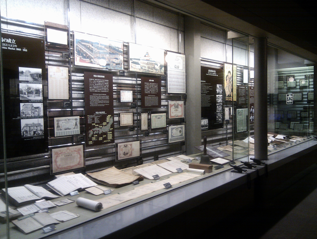 ガッカリ感がいっぱいの東京証券取引所でしたが、「証券史料ホール」というのが併設されています。こっちは株にある程度の興味を持っている人なら楽しめると思いますよ。明治以降を4つの時期に区分して、株式取引の歴史を振り返るというもの。さまざまな史料が展示されていて、たとえば日本で初めて発行された株券なども見られます。