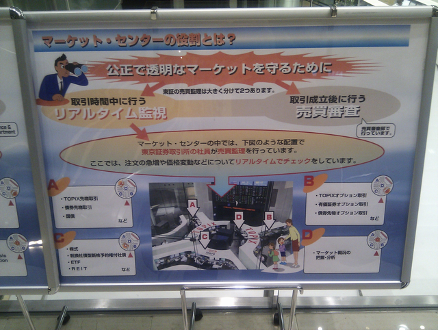 電光掲示板の下にはコンピュータが並んでいて、画面を見ながら何か作業をしています。ここは「マーケットセンター」と呼ばれます。中で働いているのは東証の職員であり、取り引きの監視をしているとのこと。4つのエリアに分かれていて、それぞれ分担するジャンルが違うみたいです。なんだか動物園のオリの中で働かされているようで、中の人は気持ち悪くないのでしょうか。僕はこんなところでみんなに見られながら働くのはイヤです。